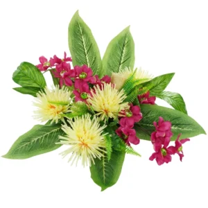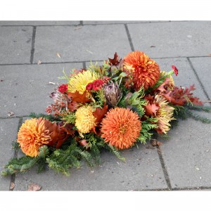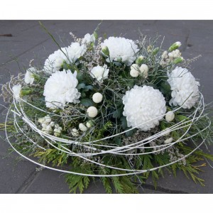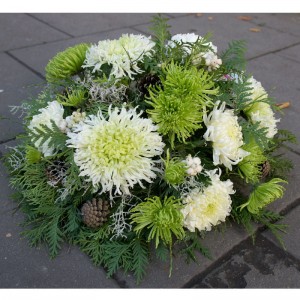 Zwarta, okrągła kompozycja wykonana w naczyniu, nieco podniesiona, więc ładnie się prezentuje na grobie. Wykonana w żywej kolorystyce z sezonowych kwiatów w zielono-kremowych odcieniach i szarej zieleni. W wiązance użyto chryzantemy strzępiastej, która dostępna jest tylko w terminie X – XI. W wiązankach zamówionych w innych miesiącach niż październik i listopad stosujemy zamienniki dla chryzantemy np. hortensja, dalia.